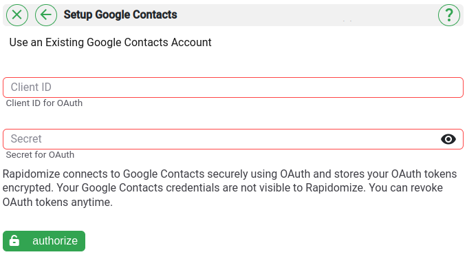 To use Google Contacts with Rapidomize, you must connect your Google account to Rapidomize. If you already have an account with Google you can use it. If not, you need to create an account with Google.