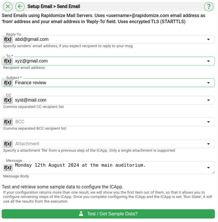 You can send Email via Rapidomize’s SMTP server. Note that when you use Rapidomize’s SMTP server, your email will carry “on behalf of abc@xyz (your Email address)” as the sender’s Email address. It will be sent as a “no-reply” mail and your Email address is also provided in